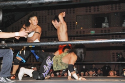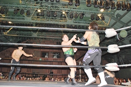 遠藤ロープで逆上がり、勝利を確信したYAZAWAの後頭部目がけてドロップキック(左写真)。YAZAWAオーバー・ザ・トップロープで場外転落、遠藤一人勝ち残り。。