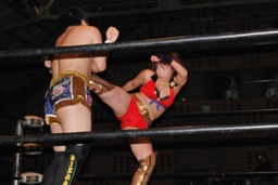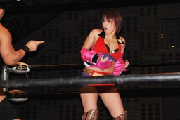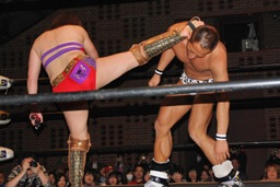 華名バズソーキック、松永がカット。美央入って佐藤にキック(右写真)。