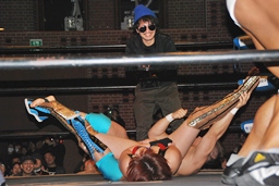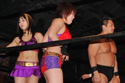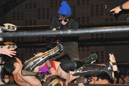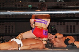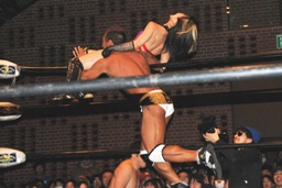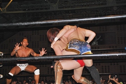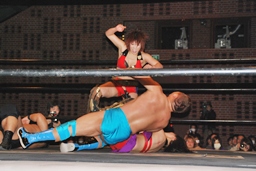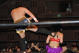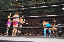 松永が入るが高木は2人をコーナーに振って串刺しラリアット、2人まとめて担ぐと(左写真)バックフリップ。華名にタッチ。