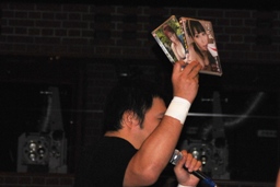 佐藤2人のDVDを手に「我々の事業内容は女子プロレス界の新しい未来を作る。華名、紫雷美央、高木三四郎、俺はこの3人の女子レスラーに言いたいことがある!巷では女子プロレスラーがこのようなDVDを発売しているそうです。アナタ方2人のDVDですね。もちろん知っています。これは私物だからです。お世話になります。こいつら売店で売ってんだよ。このようなDVDを出して、『私はエロカワ』などと言ってるんです。」(左写真)
