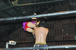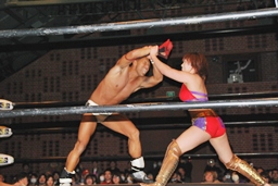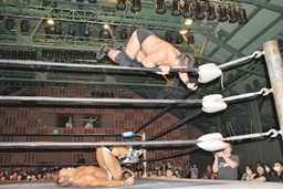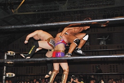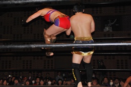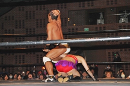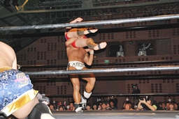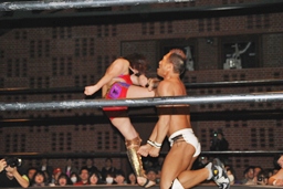 コーナーに上ってミサイルキック(右写真)、高木にタッチ。佐藤もマイケルにタッチ。