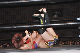 開脚エビ固めでフォールに入る、華名がカット(左写真)。