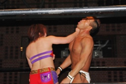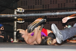 佐藤がロープにローション垂らしマイケルが超高速ヘンタイスライド(左写真)、美央は股間にダメージ。マイケルカバー、カウント2。佐藤にタッチ。