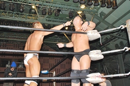 佐藤が華名をコブラツイストに捕え「俺ごと揉んでくれー!」、マイケルが両手を前に付き出して前進(右写真)、