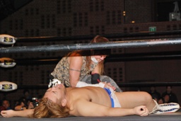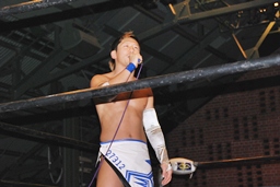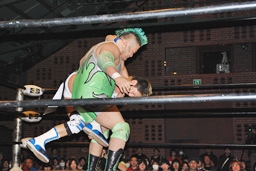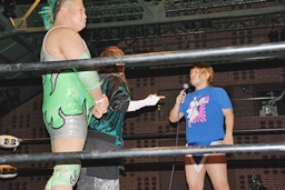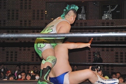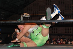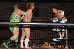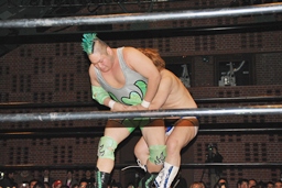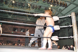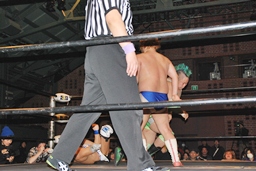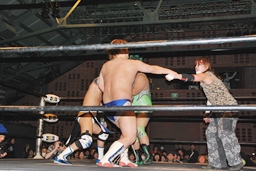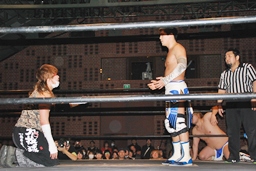 大石が「ディーノ!」と声を掛けるがディーノは「気安く呼ぶな!」(左写真)自力でロープ。ディーノパイプカッター、大石がタッチ求めるが「だって投げないじゃない!」と拒否。入江パンチ、ターンバックルにぶつけてニラにタッチ。