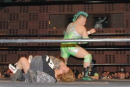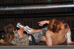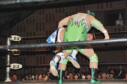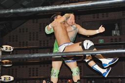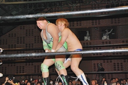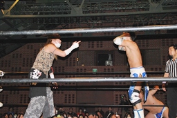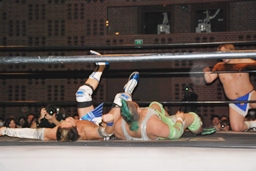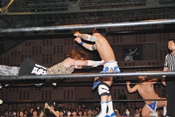 上になって男色クロー(右写真)。ディーノまたバック取る、ニラがカット。入江はニラにタッチ。ニラ「お前ユニット辞めたんだから頑張れよ。」入江必死に否定。