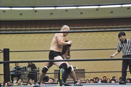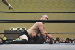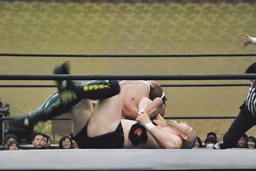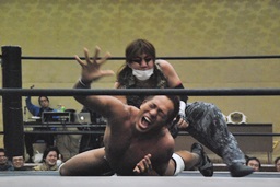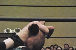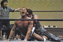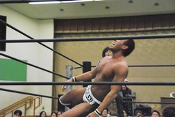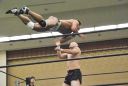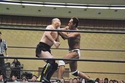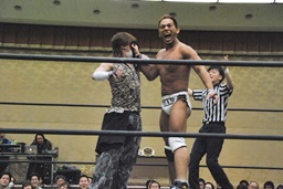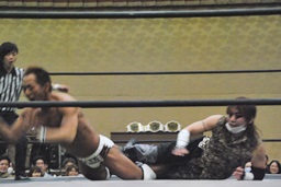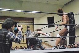 佐藤ロープに飛ぶ、マイケルキャッチして強引に持って行く(左写真)、カウント2。