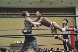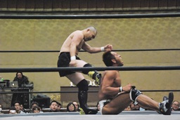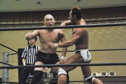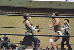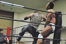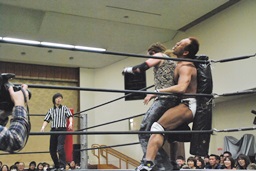 佐藤ストンピング、コーナーに振って串刺しラリアット(左写真)。