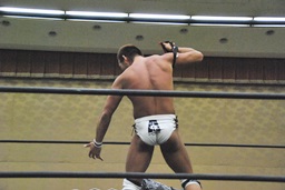 佐藤は息を止めてマイケルのアンダータイツつけた腕をアームロック(左写真)、マイケルギブアップ