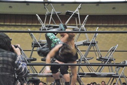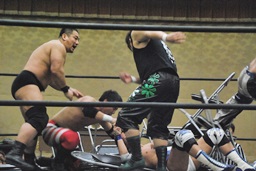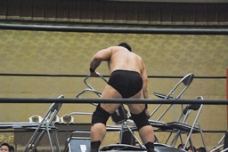 HARASHIMAボディスラムからギロチンドロップ、カウント2。高木「もっと静かにやれ!」HARASHIMAは妻木にタッチ。妻木も大石をボディスラム(右写真)、振動で城が揺らぐ。