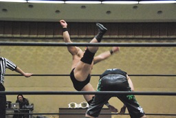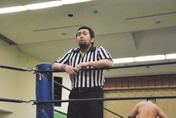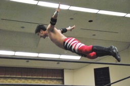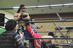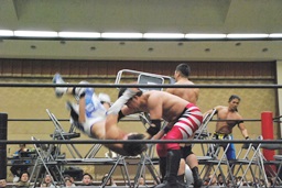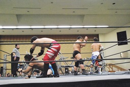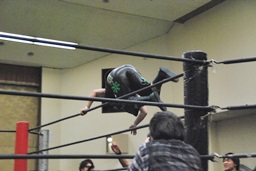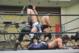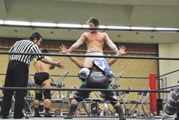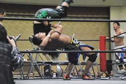 妻木ボディスラム、コーナーに上ってダイビングヘッドバット(右写真)、2人がカット。