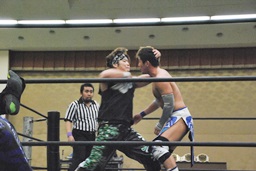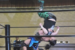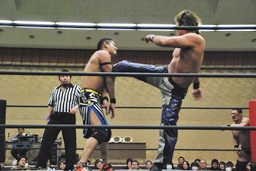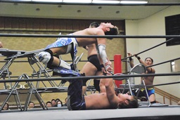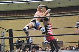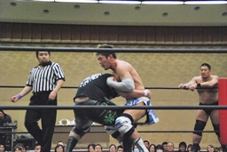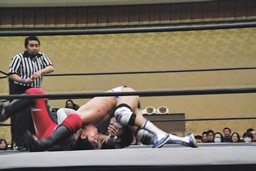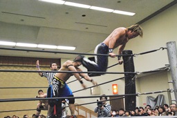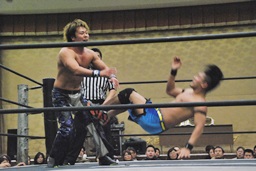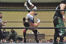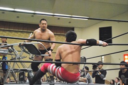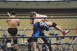 彰人がウラノをコーナーに振って串刺しショルダーアタックからダブルアームスープレックス(右写真)、