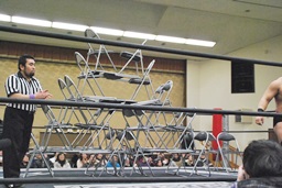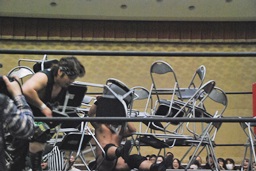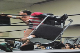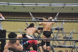 高木は妻木をイスで突いて「静かにしろって言ってるだろが!」(左写真)妻木はHARASHIMAにタッチ。