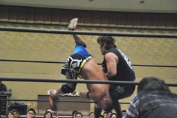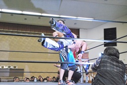 ウラノロープに振ってマンハッタンドロップ(右写真)、妻木にタッチ。