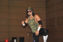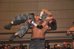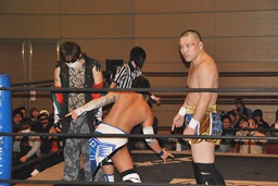 大石ロープに振る、佐々木切り返してドロップキック(左写真)、アントンにタッチ。