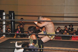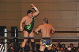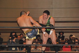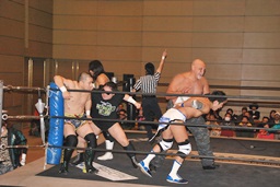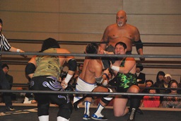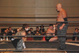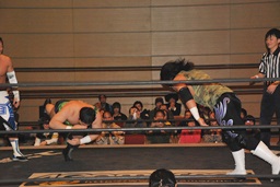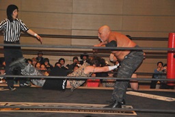 佐藤「ハゲで悪いか!」と叫んでサッカーボールキック(左写真)、カウント2。ストンピング打ち込んで大石にタッチ。
