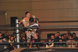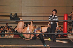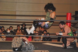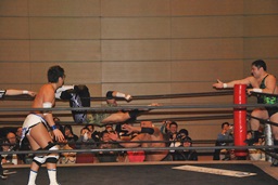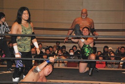 佐藤が逆片エビに固めると大石がセカンドロープから飛んでミサイルキック(左写真)。