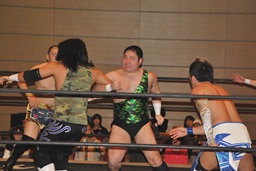 佐藤と大石切り返す。大石佐々木を羽交い絞め、しかし佐々木かわし佐藤のハイキックは大石に誤爆(右写真)。