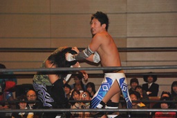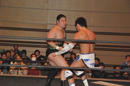 エルボーに行くが大石と佐藤はかわして逆に串刺しエルボー(左写真)。