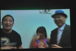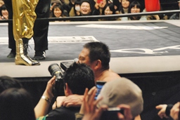 ゆずポン入場、高木寝っ転がってポーズ(右写真)。コーナー下の小川社長は既に不安げな表情。