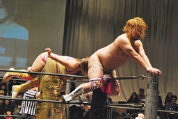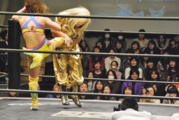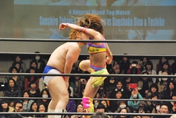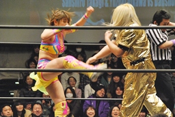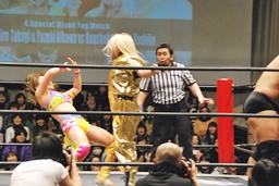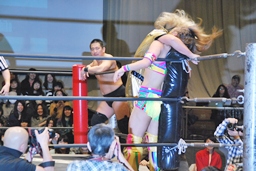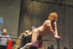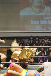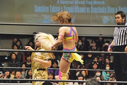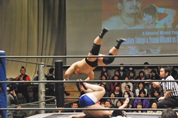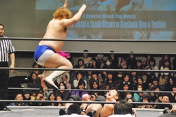 愛川ダブルの攻撃かわし2人にキック、世W虎にバックスピンキック、カバー、ディーノがカット。高木入って世W虎にダブルのゆずポンキック(左写真)、愛川カバー、カウント2。