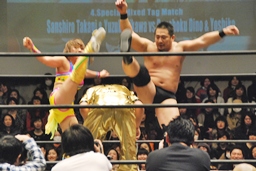 愛川コーナーに振る、世W虎切り返して串刺しラリアット(右写真)、ディーノにタッチ。愛川も高木にタッチ。
