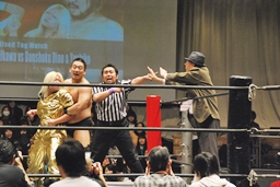 高木が世W虎を羽交い絞めして愛川に「俺ごとパイパイアタック」要求、何かを察知した小川社長がエプロンに上がってロッシーストップ(右写真)、高木は聞かず。