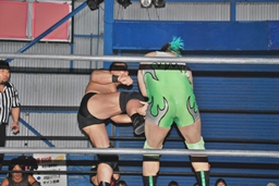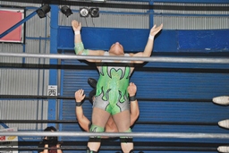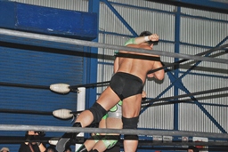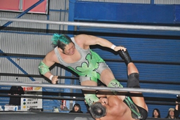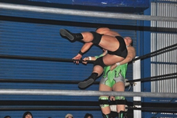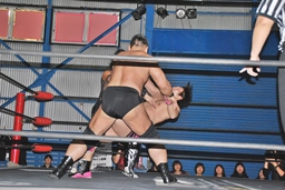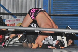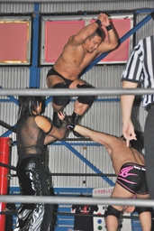 入江ショルダーブロック、MIKAMIを抱え上げてロープに投げつける(右写真)、MIKAMIトップロープで後頭部打つ。