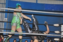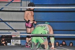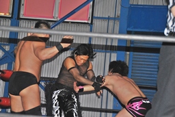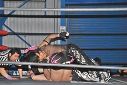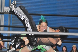MIKAMIコーナーの石井に突っ込む、石井ジャンプしてMIKAMIの背中に乗ると回転エビ固め(左写真)、カウント3。
