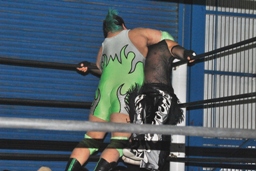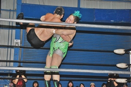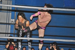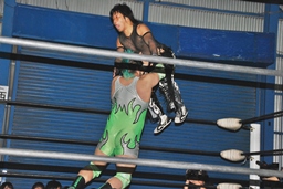 MIKAMIコーナーに詰めてブロンコバスター。MIKAMI腕をひねる、高木コーナーに上りダブルアックスハンドル落とす(左写真)。高木ボディスラムからエルボードロップ、カウント2。