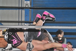 MIKAMIを抱えてそのままプレス(右写真)、カウント2。