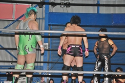 高木とMIKAMIがコーナーに上ってアピールしてるところをドリフが急襲、高木を場外に。MIKAMIにパンチ、ダブルでロープに振る、石井が入江をホイップ、入江ショルダーブロック。石井サマーソルトドロップ、入江ボディプレス、石井がカバー、カウント2。石井フィッシャーマンバスター狙う、MIKAMIブロック。石井ガットショット、MIKAMIキャッチしてドラゴンスクリュー。高木が戻り石井をロープに固定してヒップドロップ。「連携!連携!」とMIKAMIに叫ぶとダブルでロープに振ってチョップ(右写真)。MIKAMIカバー、カウント2。