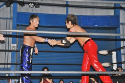 HARASHIMAヘッドシザーズから十字狙う、高尾ブロック(右写真)。高尾腕を取る、HARASHIMA切り返してハンマーロックからヘッドロック。
