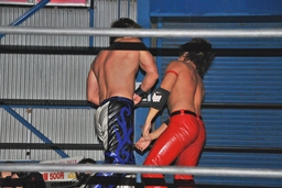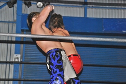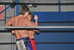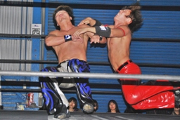 再びエルボーの打ち合い(左写真)、高尾ヘッドバット、ロープに飛ぶ、
