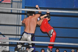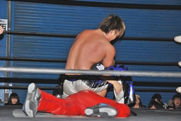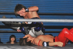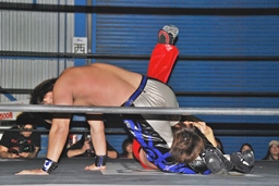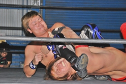HARASHIMAミドルキックで倒しキャメルクラッチ(左写真)、高尾ロープ。