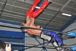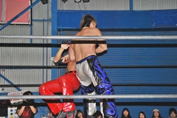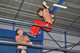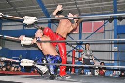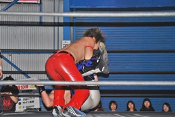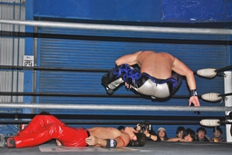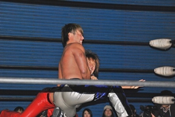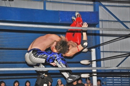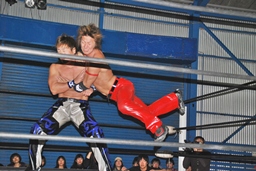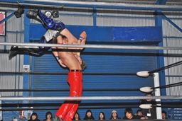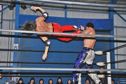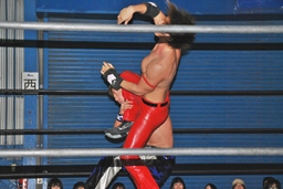 コーナーに上ってミサイルキック(右写真)、カウント2。