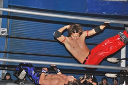 ロープワークから高尾ドロップキック(右写真)、HARASHIMA場外転落。高尾逆トペ、場外でストンピング、リングに戻してカバー、カウント1。高尾さらにストンピング、コーナーで踏みつけ。