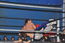 HARASHIMAコーナーに高尾を上げると「みんな元気がないぞー!」と観客を煽って雪崩式ブレーンバスター(右写真)、カウント2。見入ってだけだと思うがこの会場だと特に静かに感じるのかな?10分経過。