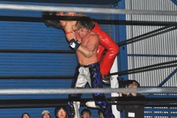 高尾シュバイン狙う、HARASHIMAブロックして逆にカナディアンバックブリーカーの体勢に担ぎ上げる(右写真)、