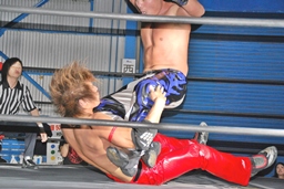 HARASHIMA蒼魔刀、高尾かわして後頭部にボマイェ(右写真)、カウント2。