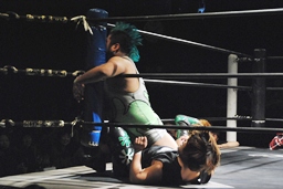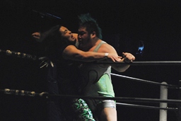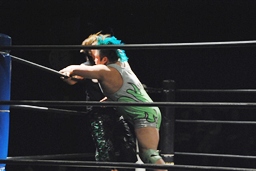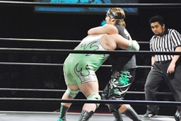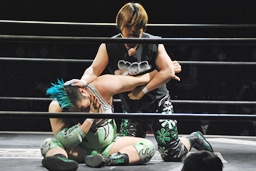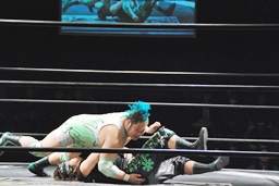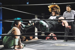 入江助走付けると場外のウラノにスライディングヘッドバット(右写真)。リングに戻してカバー、カウント2。