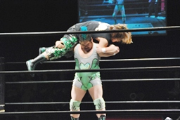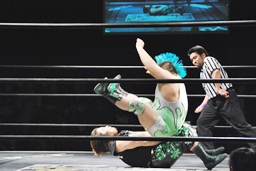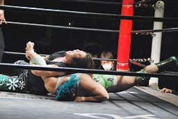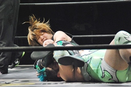 ウラノボディスラム狙う、入江ブロックして逆にボディプレス、上四方固めの形でボディプレス(左写真)。