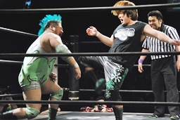 顔面にドロップキック(左写真)、入江これで鼻血。