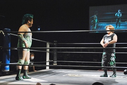ウラノが「もう一回」の意味で一本指立てると入江は勝利のVサインで応える。さらにウラノが「お前がベルト獲ったら挑戦させろ」みたいなジェスチュアを見せるが、入江とはついぞ会話が成立しなかったっぽい(左写真)。