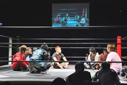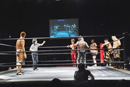 マイケル、MIKAMI、ディーノ、高梨、高尾、佐藤、ニラの7人がリングインし車座になる。
