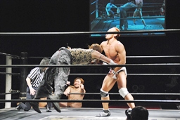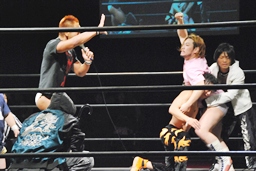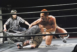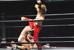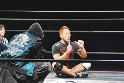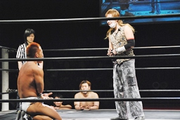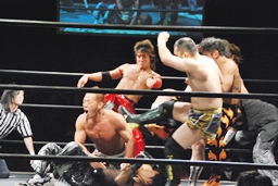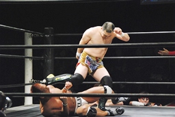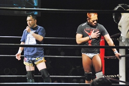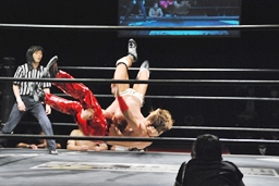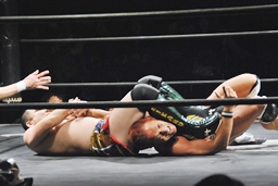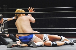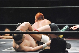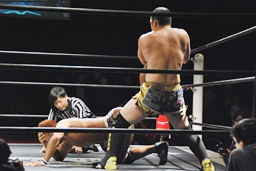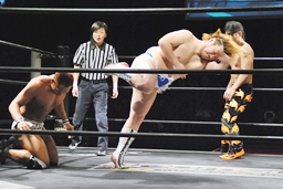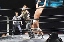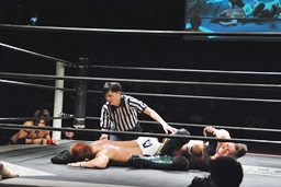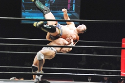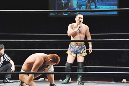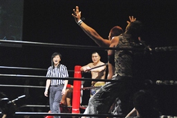 再度バックフリップ狙うが高尾は着地してトラースキック、シュバイン、カウント2。最後はボマイェ(左写真)、カウント3。