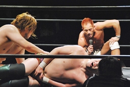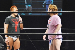 佐藤「マイケル!・・・以外の皆様に私は言いたいことがあります。私は皆さんより少しだけこの男と行動を共にしてきました。中澤マイケル、こんなことばかり言っているけど、ちょっとだけ気持ちを伝えるのがヘタクソなんです。我々DDTがインディー、インディーと言われるのは慢性的な資金難のせいです。それはこの男のチケットバックが原因です。凄い数のチケットを売って、凄いチケットバックを要求するんです。コイツにチャンピオンベルトを巻かせれば、責任感も芽生えるし、我々だって潤います。考えてみてください、今年の両国もすぐです。この中にケニーからベルトを獲れる奴は何人いますか?もし、この男がベルトを獲ってしまえば、この6人だけでなく、会場のお客さんだって獲れる可能性だってあるわけです。そっちの方が楽しいでしょう!」(右写真)