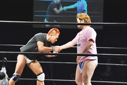 ダブルでロープに振ってエルボー、マイケルかわすが走って来たところを高梨がキャッチしてフラップジャックの形でディーノのタイツに突っ込む、ディーノ男色ドライバー(左写真)、高梨がカバー、カウント3。