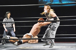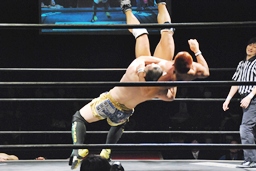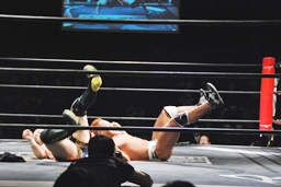 コーナーに振って串刺しラリアットから水車落とし(右写真)、カウント2。