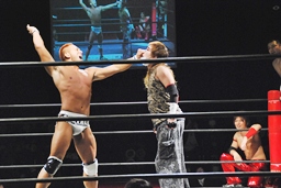 マイケルバック取ってリストクラッチ狙うが佐藤は前転してアンクルホールドに。マイケルはギブアップを拒んだが、遠藤がディーノの指示でタオル代わりのシャツを投げ込みレフェリーストップ(左写真)。